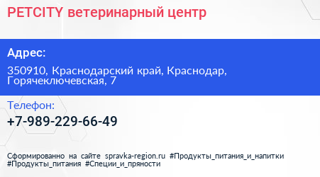 PETCITY, ветеринарный центр по адресу 350910, Краснодарский край, Краснодар, Горячеключевская, 7 в дальнейшем Организация, размещена в следующих категориях: