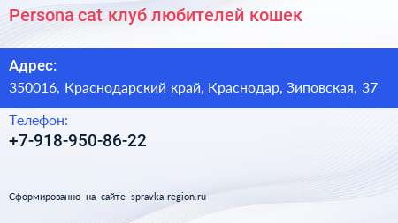 Persona-cat, клуб любителей кошек по адресу 350016, Краснодарский край, Краснодар, Зиповская, 37 в дальнейшем Организация, размещена в следующих категориях: