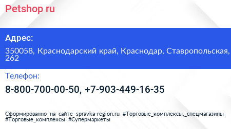Petshop.ru по адресу 350058, Краснодарский край, Краснодар, Ставропольская, 262 в дальнейшем Организация, размещена в следующих категориях: