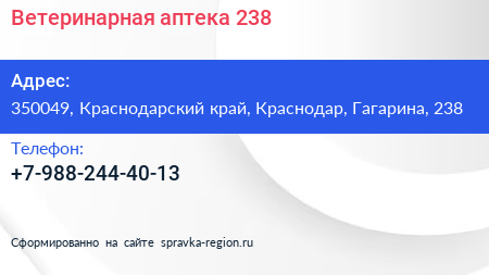 Ветеринарная аптека №238 по адресу 350049, Краснодарский край, Краснодар, Гагарина, 238 в дальнейшем Организация, размещена в следующих категориях: