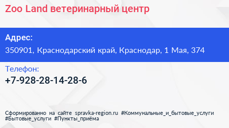 Zoo Land, ветеринарный центр по адресу 350901, Краснодарский край, Краснодар, 1 Мая, 374 в дальнейшем Организация, размещена в следующих категориях:
