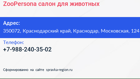 ZooPersona, салон для животных по адресу 350072, Краснодарский край, Краснодар, Московская, 124 в дальнейшем Организация, размещена в следующих категориях: