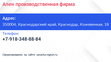 Ален, производственная фирма по адресу 350004, Краснодарский край, Краснодар, Кожевенная, 18 в дальнейшем Организация, размещена в следующих категориях: