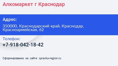 Алкомаркет, г. Краснодар по адресу 350000, Краснодарский край, Краснодар, Красноармейская, 62 в дальнейшем Организация, размещена в следующих категориях: