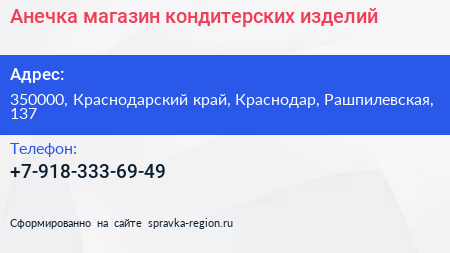 Анечка, магазин кондитерских изделий по адресу 350000, Краснодарский край, Краснодар, Рашпилевская, 137 в дальнейшем Организация, размещена в следующих категориях:
