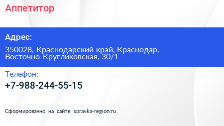 Аппетитор по адресу 350028, Краснодарский край, Краснодар, Восточно-Кругликовская, 30/1 в дальнейшем Организация, размещена в следующих категориях: