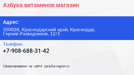 Азбука витаминов, магазин по адресу 350028, Краснодарский край, Краснодар, Героев-Разведчиков, 12/1 в дальнейшем Организация, размещена в следующих категориях: