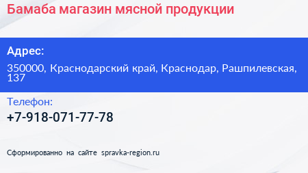 Бамаба, магазин мясной продукции по адресу 350000, Краснодарский край, Краснодар, Рашпилевская, 137 в дальнейшем Организация, размещена в следующих категориях: