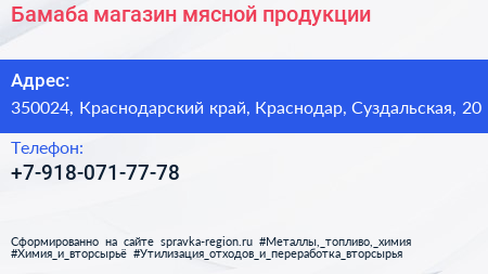 Бамаба, магазин мясной продукции по адресу 350024, Краснодарский край, Краснодар, Суздальская, 20 в дальнейшем Организация, размещена в следующих категориях: