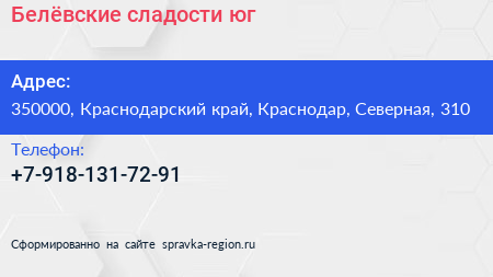 Белёвские сладости-юг по адресу 350000, Краснодарский край, Краснодар, Северная, 310 в дальнейшем Организация, размещена в следующих категориях: