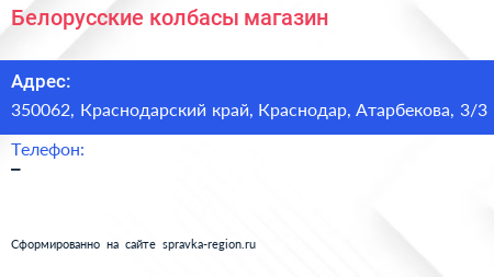 Белорусские колбасы, магазин по адресу 350062, Краснодарский край, Краснодар, Атарбекова, 3/3 в дальнейшем Организация, размещена в следующих категориях: