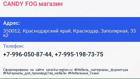 CANDY FOG, магазин по адресу 350012, Краснодарский край, Краснодар, Заполярная, 35 к2 в дальнейшем Организация, размещена в следующих категориях: