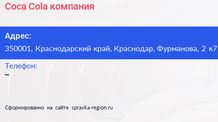 Coca-Cola, компания по адресу 350001, Краснодарский край, Краснодар, Фурманова, 2 к7 в дальнейшем Организация, размещена в следующих категориях: