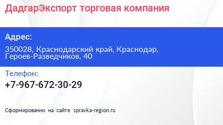 ДадгарЭкспорт, торговая компания по адресу 350028, Краснодарский край, Краснодар, Героев-Разведчиков, 40 в дальнейшем Организация, размещена в следующих категориях: