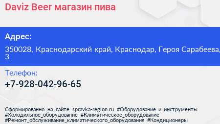Daviz Beer, магазин пива по адресу 350028, Краснодарский край, Краснодар, Героя Сарабеева, 3 в дальнейшем Организация, размещена в следующих категориях: