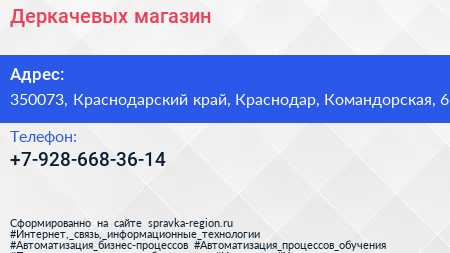 Деркачевых, магазин по адресу 350073, Краснодарский край, Краснодар, Командорская, 6 в дальнейшем Организация, размещена в следующих категориях: