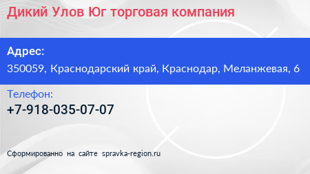 Дикий Улов Юг, торговая компания по адресу 350059, Краснодарский край, Краснодар, Меланжевая, 6 в дальнейшем Организация, размещена в следующих категориях: