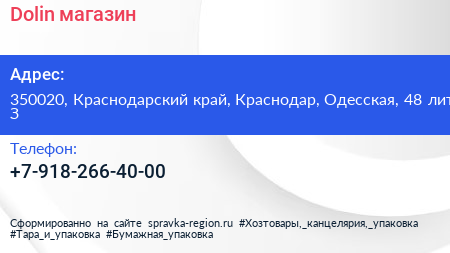 Dolin, магазин по адресу 350020, Краснодарский край, Краснодар, Одесская, 48 лит З в дальнейшем Организация, размещена в следующих категориях: