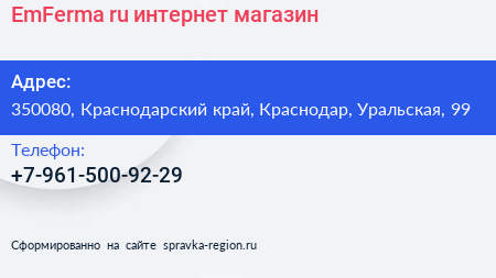 EmFerma.ru, интернет-магазин по адресу 350080, Краснодарский край, Краснодар, Уральская, 99 в дальнейшем Организация, размещена в следующих категориях:
