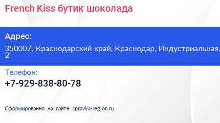 French Kiss, бутик шоколада по адресу 350007, Краснодарский край, Краснодар, Индустриальная, 2 в дальнейшем Организация, размещена в следующих категориях: