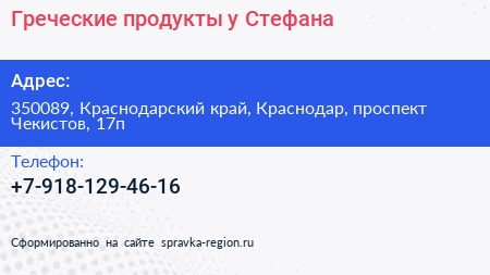 Греческие продукты у Стефана по адресу 350089, Краснодарский край, Краснодар, проспект Чекистов, 17п в дальнейшем Организация, размещена в следующих категориях: