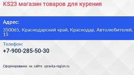 KS23, магазин товаров для курения по адресу 350065, Краснодарский край, Краснодар, Автолюбителей, 15 в дальнейшем Организация, размещена в следующих категориях: