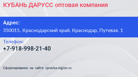 КУБАНЬ-ДАРУСС, оптовая компания по адресу 350015, Краснодарский край, Краснодар, Путевая, 1 в дальнейшем Организация, размещена в следующих категориях:
