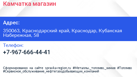 Камчатка, магазин по адресу 350063, Краснодарский край, Краснодар, Кубанская Набережная, 58 в дальнейшем Организация, размещена в следующих категориях: