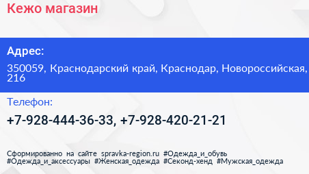 Кежо, магазин по адресу 350059, Краснодарский край, Краснодар, Новороссийская, 216 в дальнейшем Организация, размещена в следующих категориях: