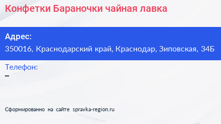Конфетки-Бараночки, чайная лавка по адресу 350016, Краснодарский край, Краснодар, Зиповская, 34Б в дальнейшем Организация, размещена в следующих категориях: