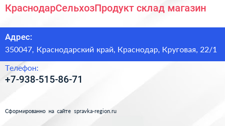 КраснодарСельхозПродукт, склад-магазин по адресу 350047, Краснодарский край, Краснодар, Круговая, 22/1 в дальнейшем Организация, размещена в следующих категориях: