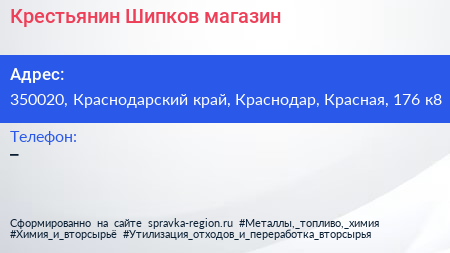 Крестьянин Шипков, магазин по адресу 350020, Краснодарский край, Краснодар, Красная, 176 к8 в дальнейшем Организация, размещена в следующих категориях: