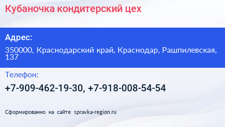 Кубаночка, кондитерский цех по адресу 350000, Краснодарский край, Краснодар, Рашпилевская, 137 в дальнейшем Организация, размещена в следующих категориях: