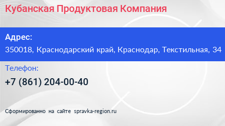 Кубанская Продуктовая Компания по адресу 350018, Краснодарский край, Краснодар, Текстильная, 34 в дальнейшем Организация, размещена в следующих категориях: