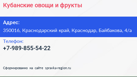 Кубанские овощи и фрукты по адресу 350016, Краснодарский край, Краснодар, Байбакова, 4/а в дальнейшем Организация, размещена в следующих категориях:
