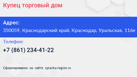 Купец, торговый дом по адресу 350059, Краснодарский край, Краснодар, Уральская, 116е в дальнейшем Организация, размещена в следующих категориях: