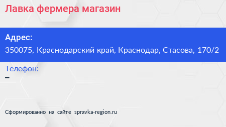 Лавка фермера, магазин по адресу 350075, Краснодарский край, Краснодар, Стасова, 170/2 в дальнейшем Организация, размещена в следующих категориях:
