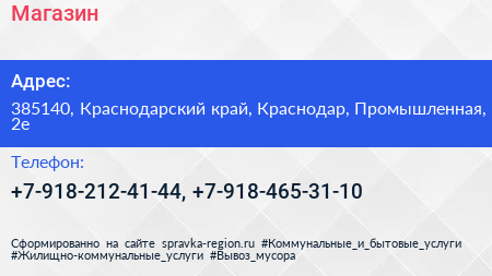 Магазин по адресу 385140, Краснодарский край, Краснодар, Промышленная, 2е в дальнейшем Организация, размещена в следующих категориях: