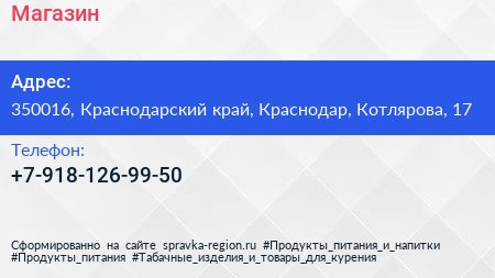 Магазин по адресу 350016, Краснодарский край, Краснодар, Котлярова, 17 в дальнейшем Организация, размещена в следующих категориях: