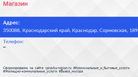 Магазин по адресу 350088, Краснодарский край, Краснодар, Сормовская, 189 в дальнейшем Организация, размещена в следующих категориях: