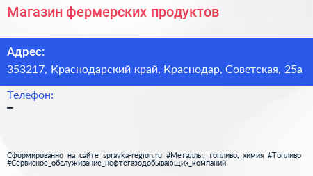 Магазин фермерских продуктов по адресу 353217, Краснодарский край, Краснодар, Советская, 25а в дальнейшем Организация, размещена в следующих категориях: