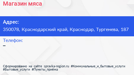 Магазин мяса по адресу 350078, Краснодарский край, Краснодар, Тургенева, 187 в дальнейшем Организация, размещена в следующих категориях: