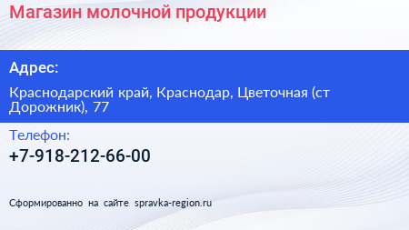 Магазин молочной продукции по адресу Краснодарский край, Краснодар, Цветочная (ст Дорожник), 77 в дальнейшем Организация, размещена в следующих категориях: