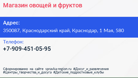 Магазин овощей и фруктов по адресу 350087, Краснодарский край, Краснодар, 1 Мая, 580 в дальнейшем Организация, размещена в следующих категориях: