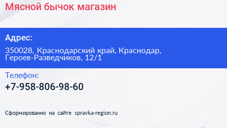 Мясной бычок, магазин по адресу 350028, Краснодарский край, Краснодар, Героев-Разведчиков, 12/1 в дальнейшем Организация, размещена в следующих категориях: