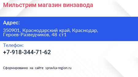 Мильстрим, магазин винзавода по адресу 350901, Краснодарский край, Краснодар, Героев-Разведчиков, 48 ст1 в дальнейшем Организация, размещена в следующих категориях: