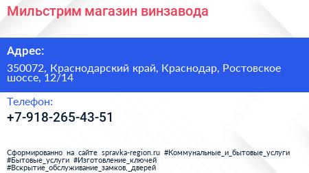 Мильстрим, магазин винзавода по адресу 350072, Краснодарский край, Краснодар, Ростовское шоссе, 12/14 в дальнейшем Организация, размещена в следующих категориях: