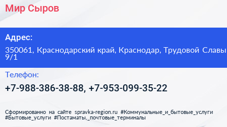 Мир Сыров по адресу 350061, Краснодарский край, Краснодар, Трудовой Славы, 9/1 в дальнейшем Организация, размещена в следующих категориях: