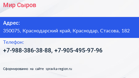 Мир Сыров по адресу 350075, Краснодарский край, Краснодар, Стасова, 182 в дальнейшем Организация, размещена в следующих категориях: