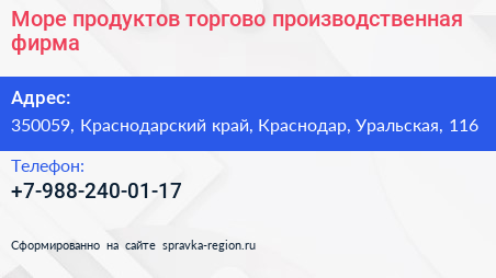 Море продуктов, торгово-производственная фирма по адресу 350059, Краснодарский край, Краснодар, Уральская, 116 в дальнейшем Организация, размещена в следующих категориях: